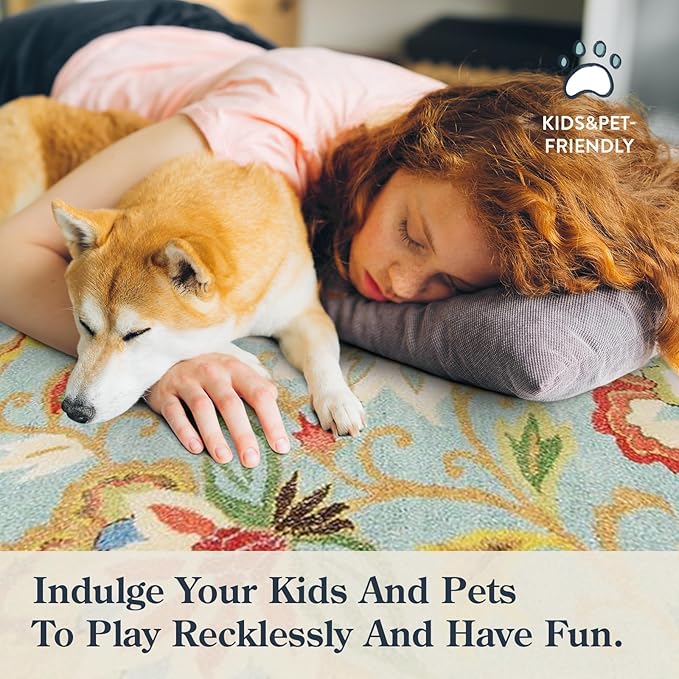 Vintage Beige Blue Living Room Rug, 6x9 Washable Area Rugs for Dining Room Under Table, Soft Low Pile Large Carpet Bedroom, Non-Slip Boho Floral (6 x 9 Beige Blue)