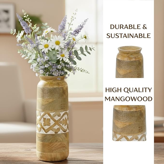 - Whitewash Mango Wooden Vase: Beautifully crafted, this exquisite whitewash Mollem large flower vases captivates with its intricate design and timeless elegance. Our centerpiece vases for decor is ideal for keeping dry buds on your TV stand, bookshelf, and more. The vases are not designed to hold water.