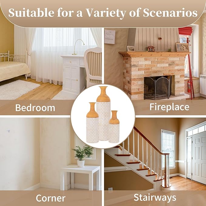 - DECORATIVE RUSTIC OVERSIZED FLOOR VASES - You will receive 3 different sizes hammered floor vases of 68/51/41cm height, which can be grouped together or used separately for your purpose. This rustic terracotta-like floor vases ideal for makeing a good statement piece for your home, the big floor vase can be stand on living room corner or fireplace, and the smallest metal vase can be placed on the tabletop as a table centerpiece.