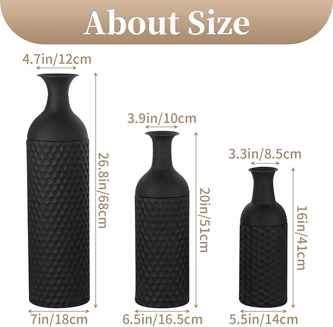 - DECORATIVE RUSTIC OVERSIZED FLOOR VASES - You will receive 3 different sizes hammered floor vases of 26.8/20/16in height, which can be grouped together or used separately for your purpose. This rustic terracotta-like floor vases ideal for makeing a good statement piece for your home, the big floor vase can be stand on living room corner or fireplace, and the smallest metal vase can be placed on the tabletop as a table centerpiece.