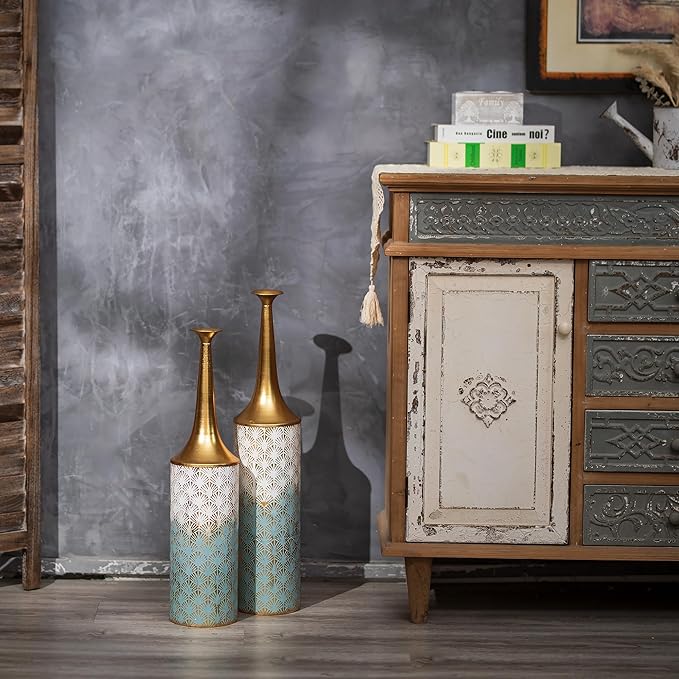 - SIZE OF 2 TALL FLORAL VASES - 2 different sizes of metallic vases meet your different purposes. Large - 25.98*5.51in/66*14cm; Small - 23.43*5.12in/59.5*13cm. This bohemian floor vase can be used separately or grouped together. FLOWERS AND PLANTS ARE NOT INCLUDED.