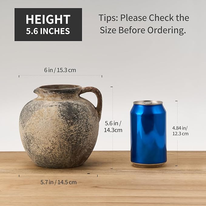 Antique Terracotta Vase with Handle, 5.6 Inch Farmhouse Ceramic Vase Boho Decor Decorative Vase, Rustic Vase for Home Decor, Living Room, Table, Wedding - Distressed Design, Gray