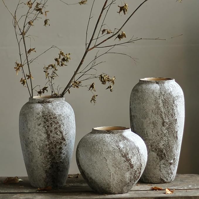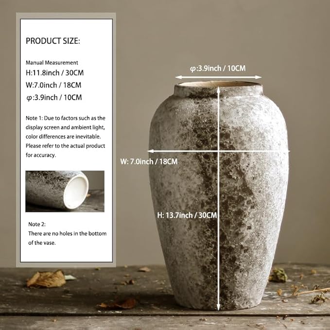- 🌷【VINTAGE FARMHOUSE VASE-】- These ceramic vase comes in 3 different heights type for medium, large and tall applications. The distressed design adds an authentic vintage touch. It's a perfect captivating centerpiece on your dining table, mantel, or sideboard. Add farmhouse charm to your living space with our rustic floor vase.
