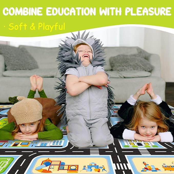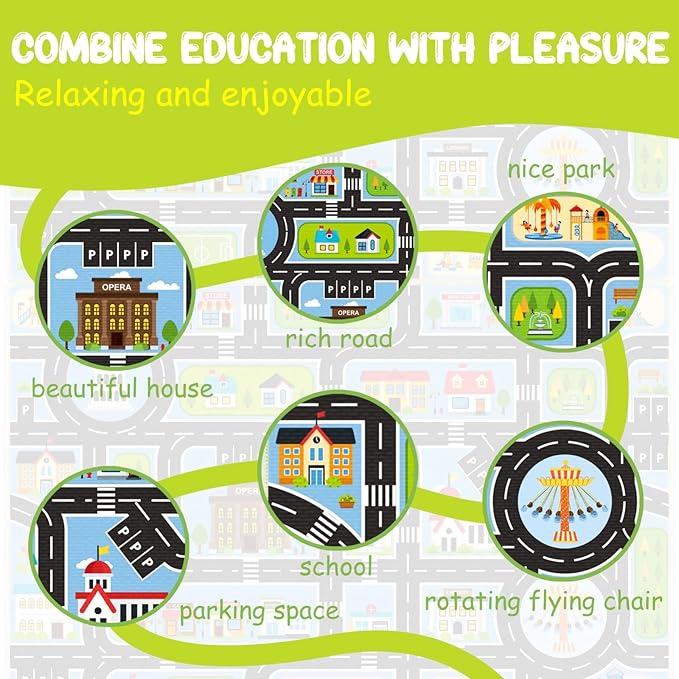 - 【Kids Car Rug Design】 Our kids car rugs are made of special yarns with a soft and comfortable surface, suitble for crawling, playing, or even napping. The kids road rugs are printed with American city and road-themed patterns. If your child is always on the move and can't sit still, this car carpet for kids endless hours of exhilarating happy playtime.