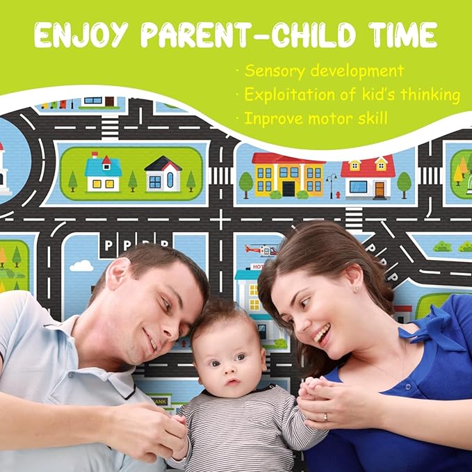 - 【Kids Car Rug Design】 Our kids car rugs are made of special yarns with a soft and comfortable surface, suitble for crawling, playing, or even napping. The kids road rugs are printed with American city and road-themed patterns. If your child is always on the move and can't sit still, this car carpet for kids endless hours of exhilarating happy playtime.