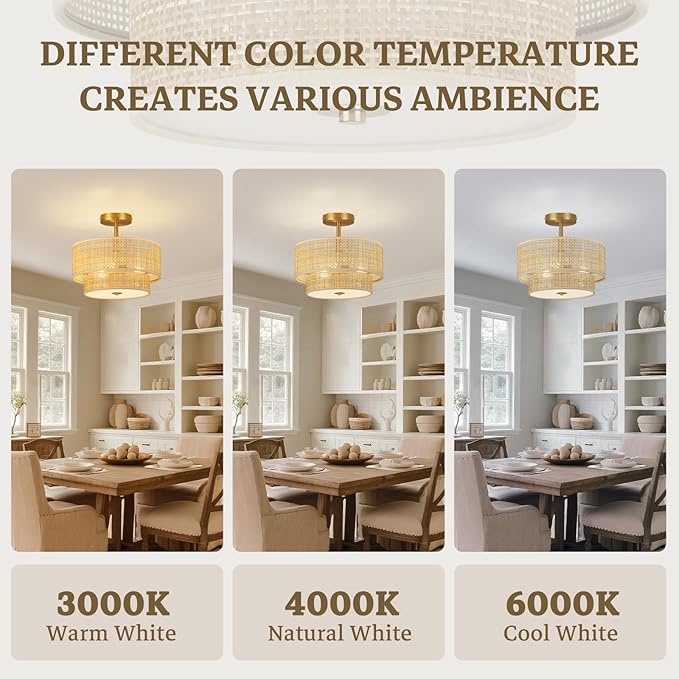 - Elegant Gold Metal Frame & Base:Designed with a luxurious gold-finished metal frame, this semi flush mount ceiling light offers durability while complementing the natural rattan texture.The sophisticated blend of rustic and modern aesthetics makes it a perfect fit for contemporary, coastal, and Scandinavian interiors.