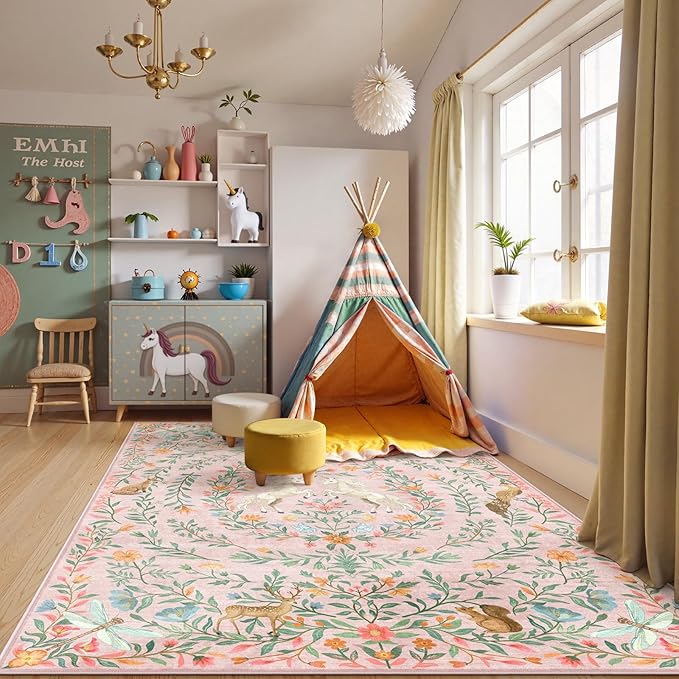 STARUIA 8x10 Area Rugs for Living Room, Unicorn Floral Non-Slip Washable Rugs, Farmhouse Moroccan Vintage Animal Pattern Large Girls Area Rug for Bedroom, Carpet for Dining Room Nurseries(Pink,8'x10')