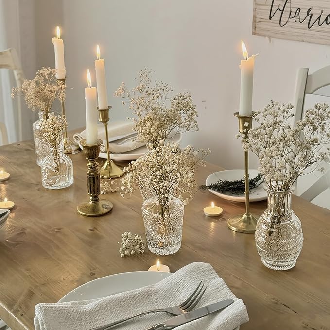 - Versatile Flower Bud Vase Set: This set comprises 16 diverse transparent glass flower bud vases, each adorned with etched designs to further elevate their charm. It is perfectly suited for any home décor. Whether placed as a centerpiece on dining tables, window sills, or wedding banquet tables, these small vintage crystal vases will lend an air of elegance to the setting.