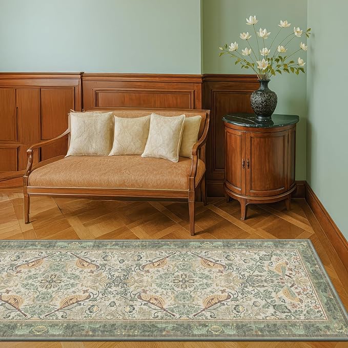 - Victorian Elegance: This vintage-style rug features a mirrored pair of songbirds nestled among intricate botanical motifs. Soft sage green, muted gold, and warm ivory tones give it a gently faded, antique look. The ornate florals and leafy vines create a romantic, nature-inspired design ideal for cottagecore, traditional, or maximalist interiors. Perfect for adding storybook charm and elegance to any room