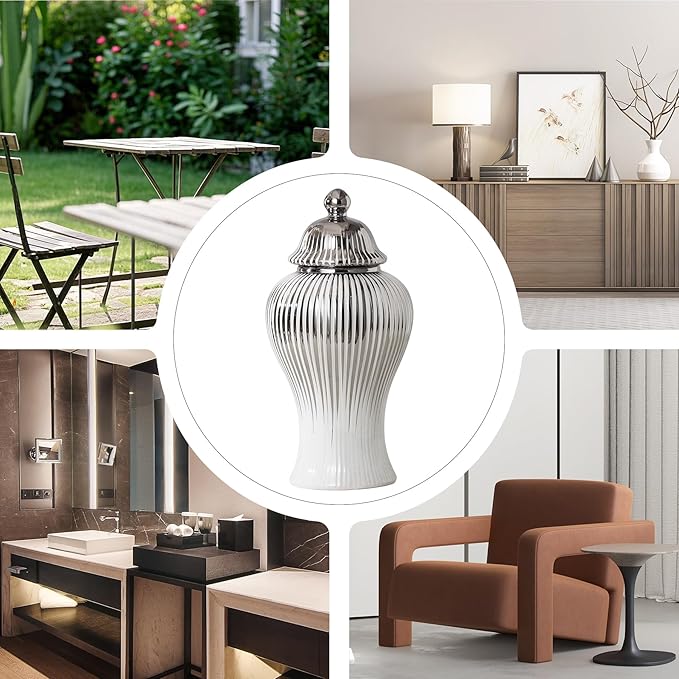 Ginger Jars for Home Decor, Ceramic Ginger Jar with Lid Modern Handmade White and Silvery, Modern Decorative Vase for Kitchen, Bookshelf Decor, Storage jar, Table Center Vase, Temple Jar(9in)