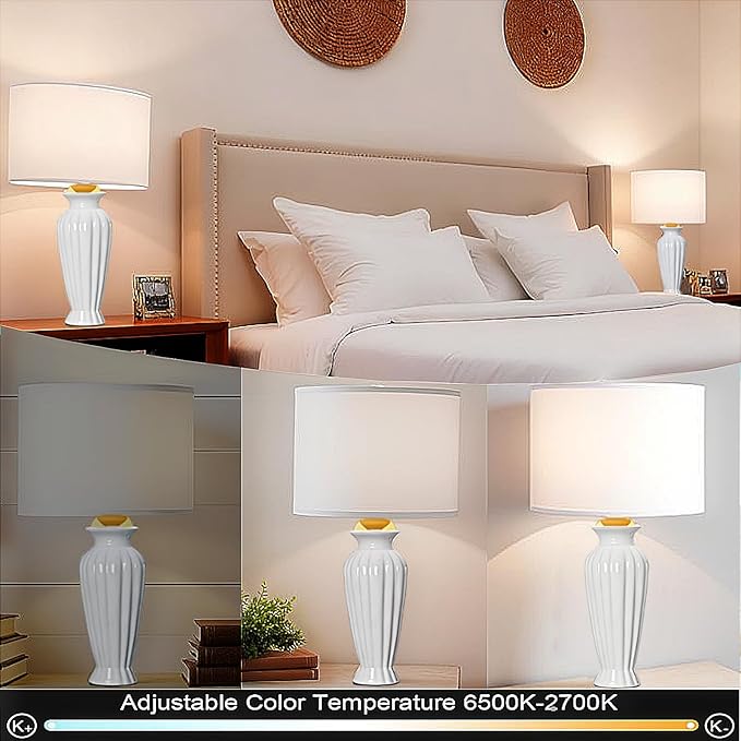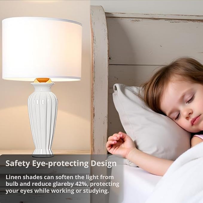 White Table Lamps for Living Room, Modern Ceramic Table Lamp for Bedroom Office Dorm, Vintage Bedside Lamps for Bedroom Decor Farmhouse